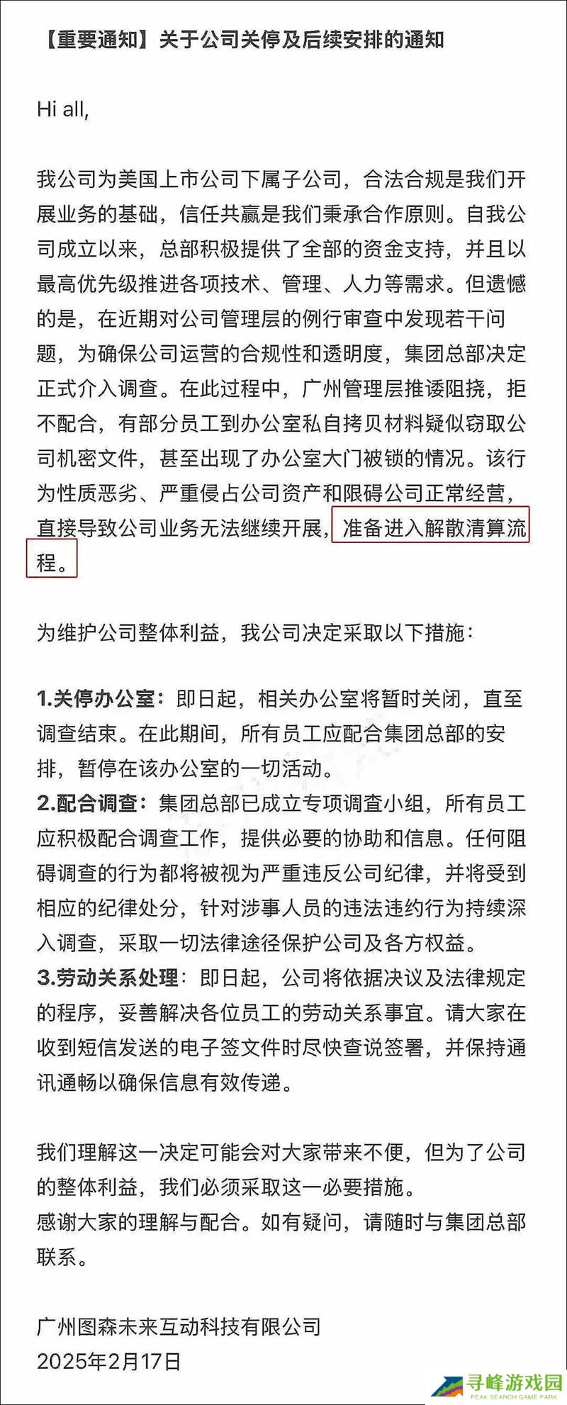 图森声明原文称:“...广州管理层推诿阻挠,拒不配合,有部分员工到办公室私自拷贝材料疑似窃取公司机密文件,甚至出现了办公室大门被锁的情况...严重侵占公司资产和限碍公司正常经营直接导致公司业务无法继续开展,准备进入解散清算流程。”