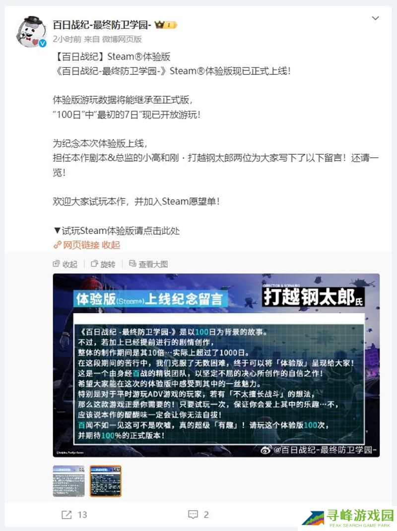 目前,Steam平台上已经上线了本作的试玩Demo。试玩版允许玩家免费体验游戏中“前7天”的故事情节,并且试玩过程中获得的存档可以无缝继承至正式版,极大地降低了玩家入手正作的门槛。官方表示,这一体验安排旨在让玩家提前感受游戏独特的叙事方式与策略性战斗,进一步激发对整个防卫战争全线挑战的期待​。