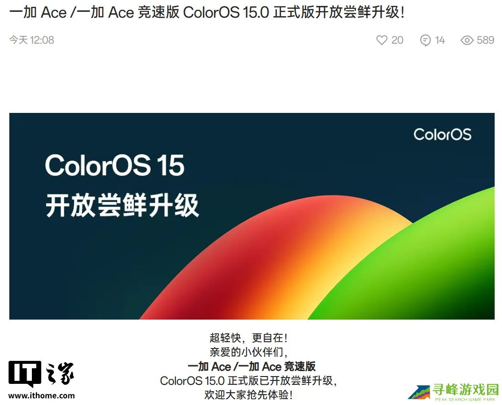 本站 2 月 20 日消息,一加官方今日发文宣布,旗下一加 Ace /一加 Ace 竞速版手机开放 ColorOS 15.0 正式版尝鲜升级,正式版的版本号在15.0.0.500及以上。