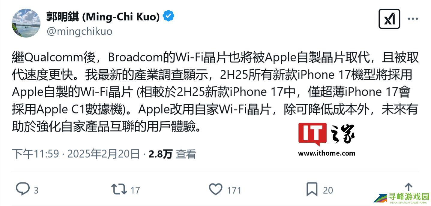 郭明錤今天在 X 平台发布推文,表示苹果今年所有的 iPhone 17 系列机型都将使用其自主研发的 Wi-Fi 芯片,此外在该系列中只有 iPhone 17 Air 一款将采用自研 5G 基带。