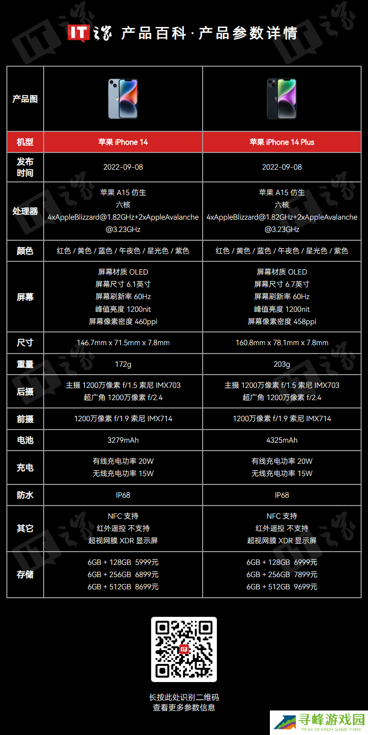iPhone 14 和 iPhone 14 Plus 于 2022 年 9 月推出,作为苹果公司年度智能手机更新的标准型号,定位低于高端 Pro 型号。本站附参数表如下: