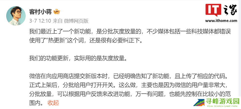 这是因为在 3 月 7 日,腾讯 WXG(微信事业群)员工 @客村小蒋 发博文称微信的功能更新,实际用的是灰度放量。