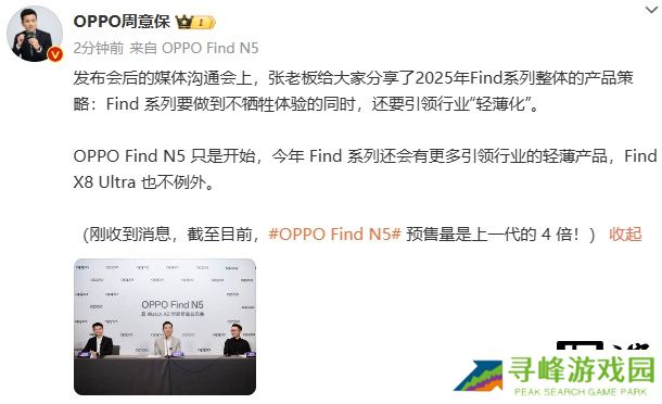 在发布会结束后的采访环节,OPPO 首席产品官、一加创始人刘作虎透露,轻薄将是今年 OPPO 产品的主旋律,包括即将到来的 Find X8 Ultra。随后,OPPO Find 系列产品负责人周意保也确认了这一消息,并表示今年 Find 系列还会有更多引领行业的轻薄产品。