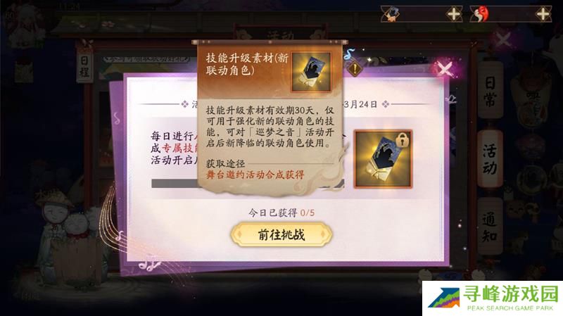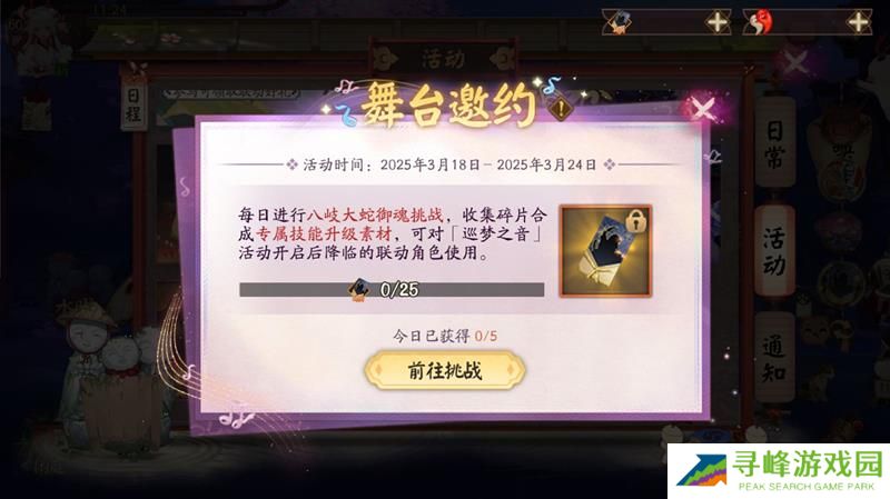 在活动期间,大人每日进行八岐大蛇御魂挑战并取得胜利后,将有几率掉落专属于即将降临的新联动角色的「技能升级素材碎片」,每日最多掉落5枚碎片,活动期间最多掉落25枚。