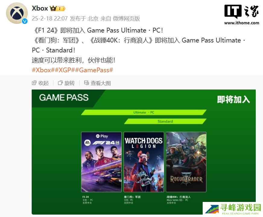 本站 2 月 18 日消息,微软 Xbox 官方今日公布了三款将加入XGP 服务的游戏,包括《看门狗:军团》《F1 24》《战锤 40K:行商浪人》。