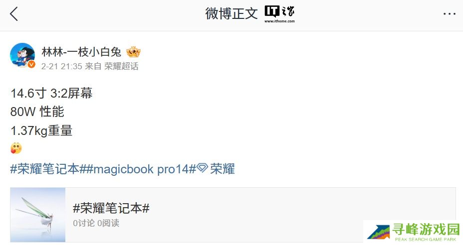 本站今日早些时候报道,林林本周还公布了 MagicBook Pro 14 笔记本部分信息:新品重约 1.37kg,屏幕尺寸为 14.6 寸、比例 3:2,支持 80W 性能释放。