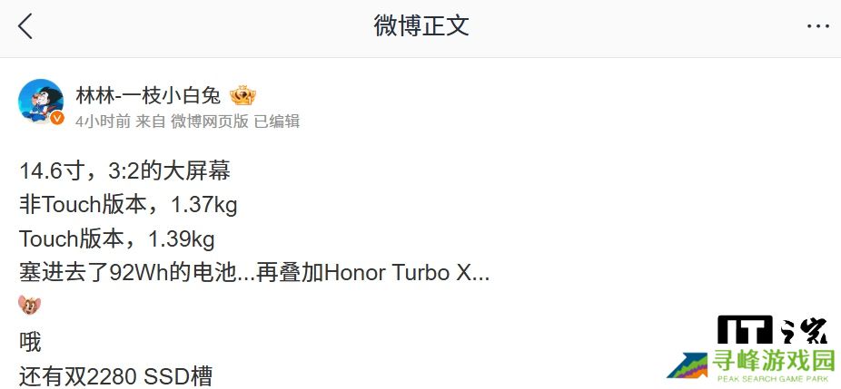 本站 2 月 23 日消息,荣耀中国区副总裁、智慧生活业务部部长林林今日再次透露了MagicBook Pro 14 笔记本新品部分细节信息:新机拥有 Touch /非 Touch 版本(产品重量分别为 1.39kg / 1.37kg),内置 92Wh 电池,提供双 2280 SSD 槽。