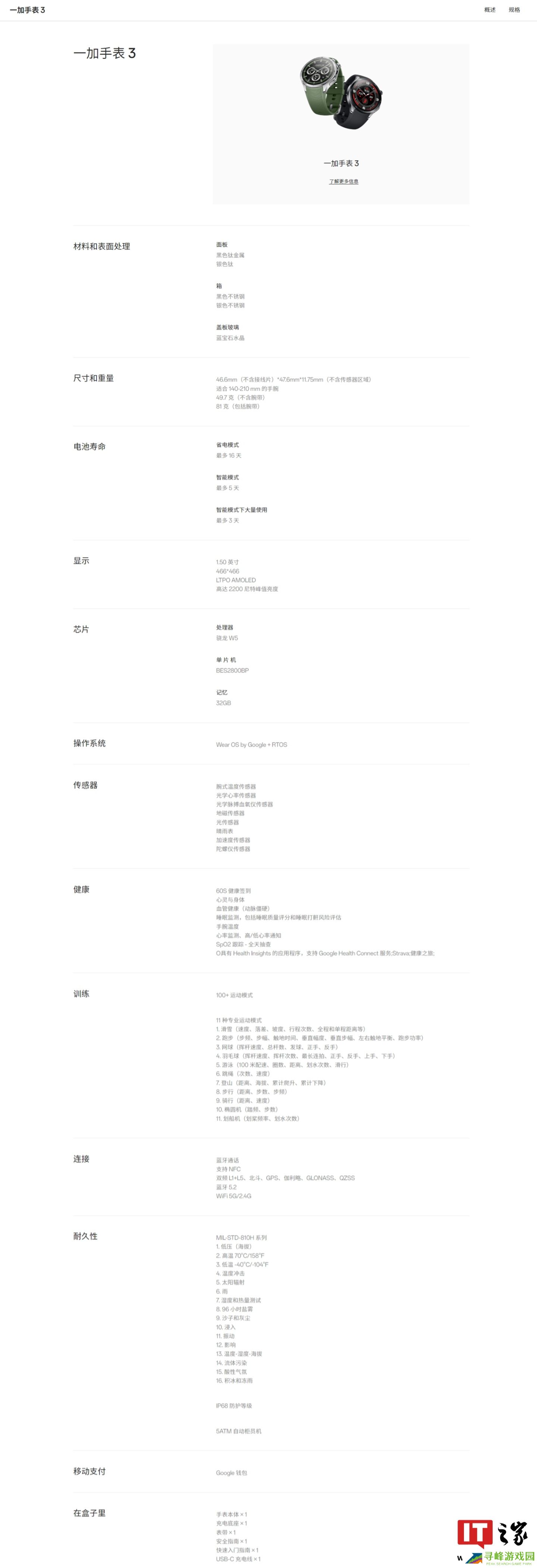 本站附一加 Watch 3 智能手表规格如下: