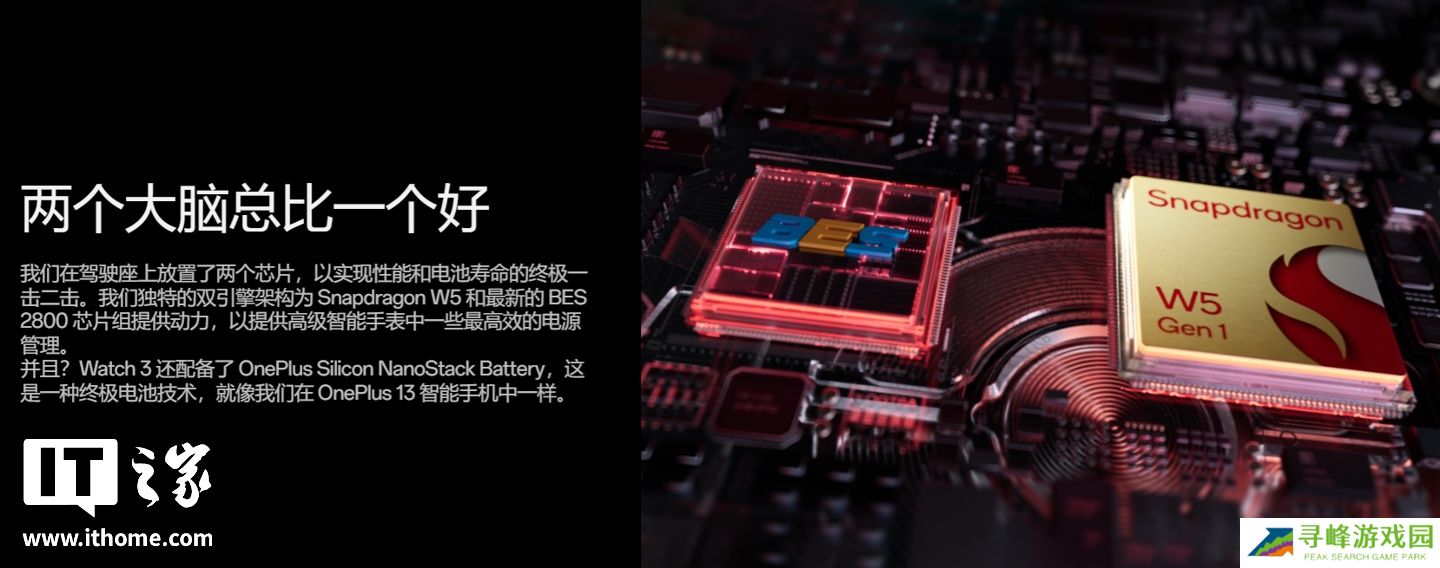 一加 Watch 3 智能手表搭载高通骁龙 W5 和 BES2800 处理器(双处理器),智能模式续航最长 5 天(宣称重度使用续航最长 3 天)、省电/ 轻智能模式续航最长 16 天。新款手表与不同于国行(预装 ColorOS),其预装 WearOS + RTOS 系统。