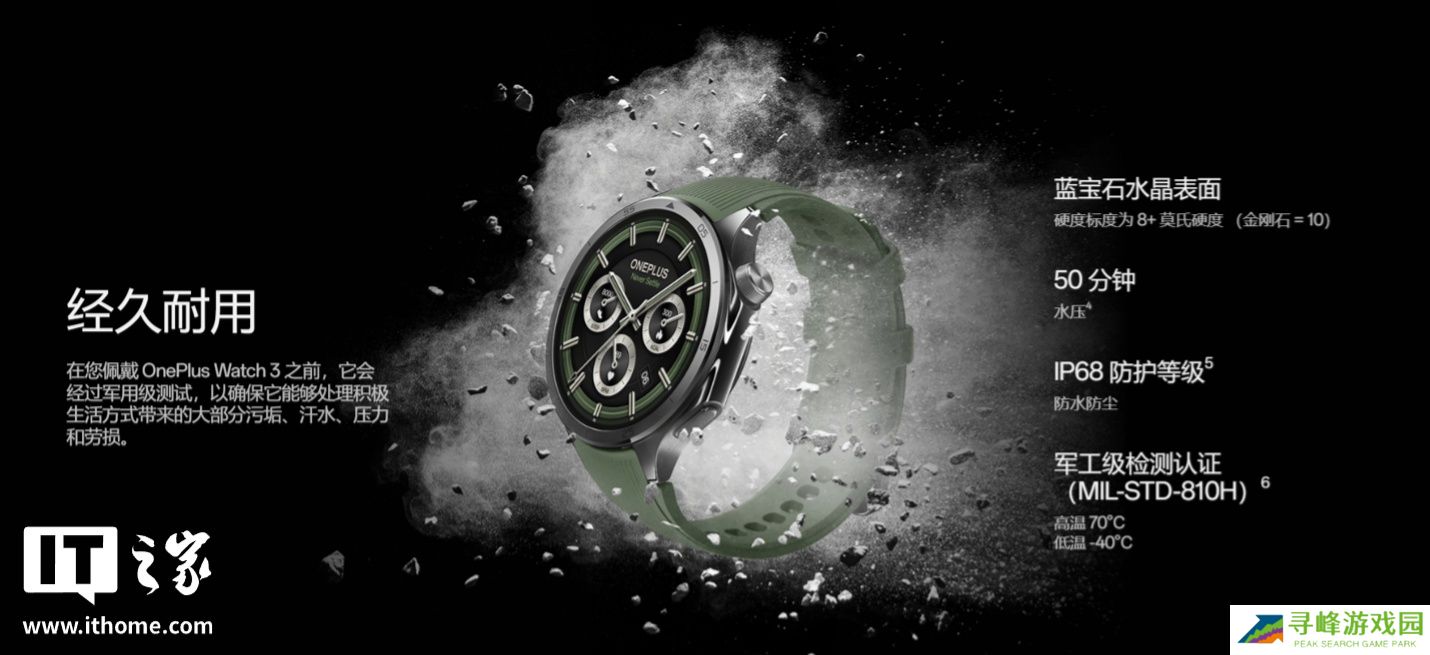 据介绍,一加 Watch 3 智能手表搭载 1.5 英寸 LTPO AMOLED 屏,辅以莫氏硬度 8+ 的蓝宝石水晶表面(金刚石 = 10),其峰值亮度达 2200 尼特(分辨率 466*466)。手表通过军工级检测认证,支持 IP68、5ATM 防尘防水。