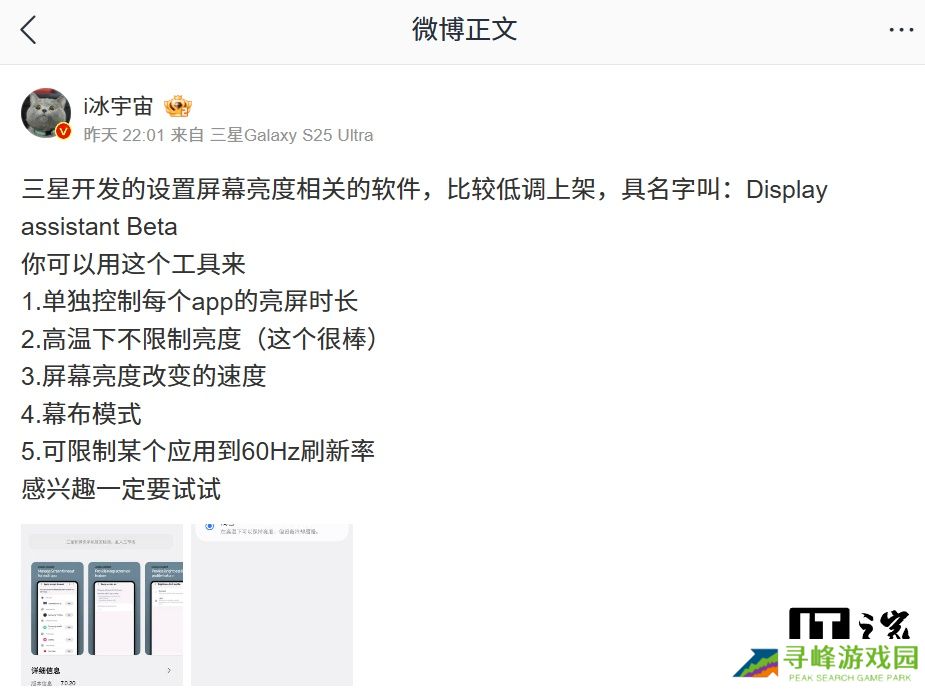 本站 3 月 11 日消息,据博主@i冰宇宙 分享,三星开发的屏幕亮度设置软件“Display Assistant Beta”低调上架,该款应用支持用户单独控制 App 亮屏时长、限制刷新率等。
