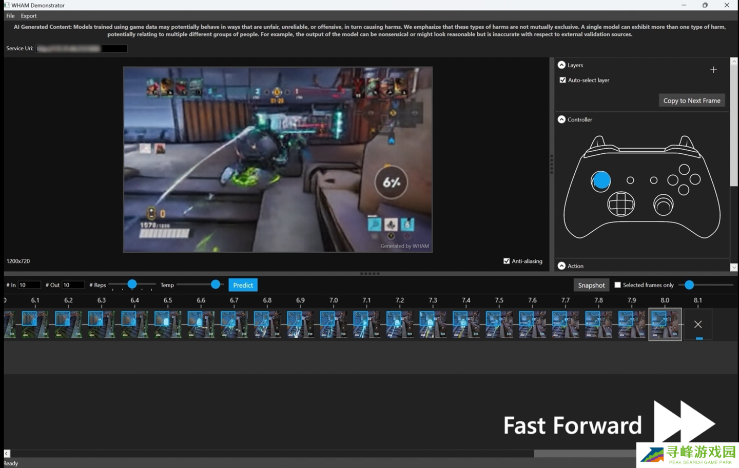 当开发者与 Muse 交互时,WHAM 演示器提供了一个用于与 WHAM 实例交互的视觉界面。只要给定一张游戏截图,就能生成多个潜在的后续游戏画面。此外,开发者可以通过 Xbox 手柄来控制角色,Muse 就能生成相应的后续内容。