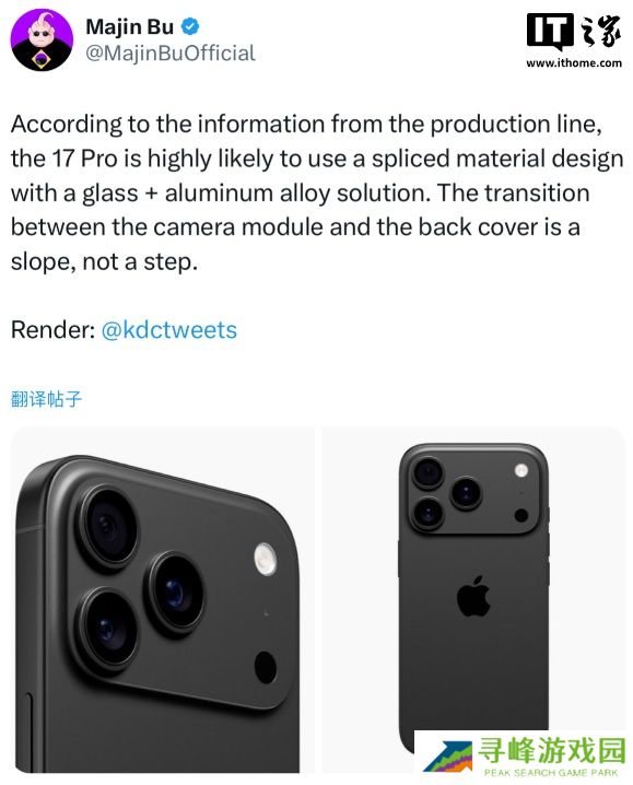 今日早些时候,海外博主Majin Bu 分享一则生产线消息,据称苹果iPhone 17 Pro可能采用铝合金和玻璃拼接设计,相机模块与后盖之间的过渡是斜面,而非阶梯状。
