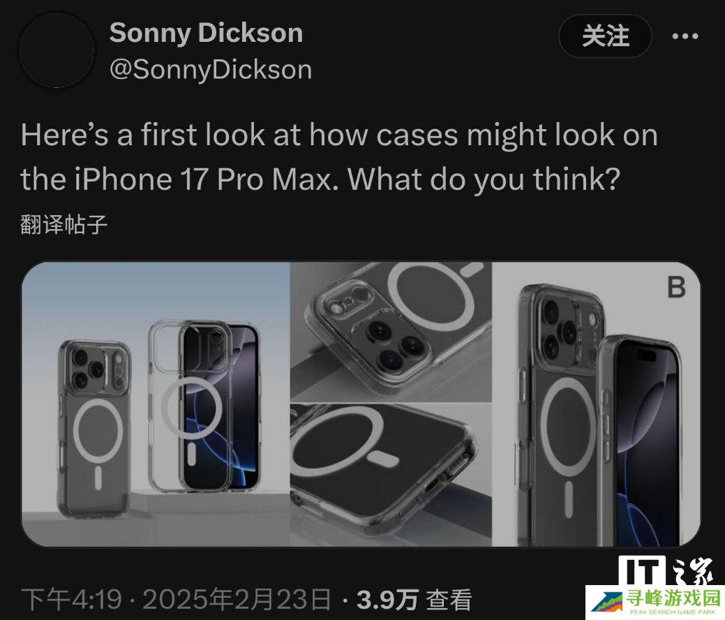 本站 2 月 23 日消息,海外博主 Sonny Dickson 今日在社交媒体上发布了一张据称是 iPhone 17 Pro Max 手机壳的渲染图,完整地展示了这款新机的外观。