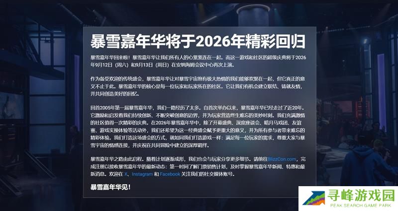 暴雪娱乐在官方《BlizzCon》网站上发布消息,确认今年将不会举办《BlizzCon》活动,但会在2026年回归。根据公告,《BlizzCon》将于2026年9月12日至13日在加利福尼亚州的阿纳海姆会议中心举行。此次确认意味着今年与去年一样,玩家们无缘线下参与这一盛会。