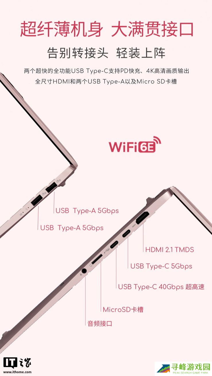 这款笔记本支持Wi-Fi 6E技术,其左侧配备1个HDMI 2.1接口、1个USB-C 5Gbps接口、1个USB-C 40Gbps接口;1个MicroSD卡槽、1个3.5mm音频接口;右侧配备2个USB-A 5Gbps接口。