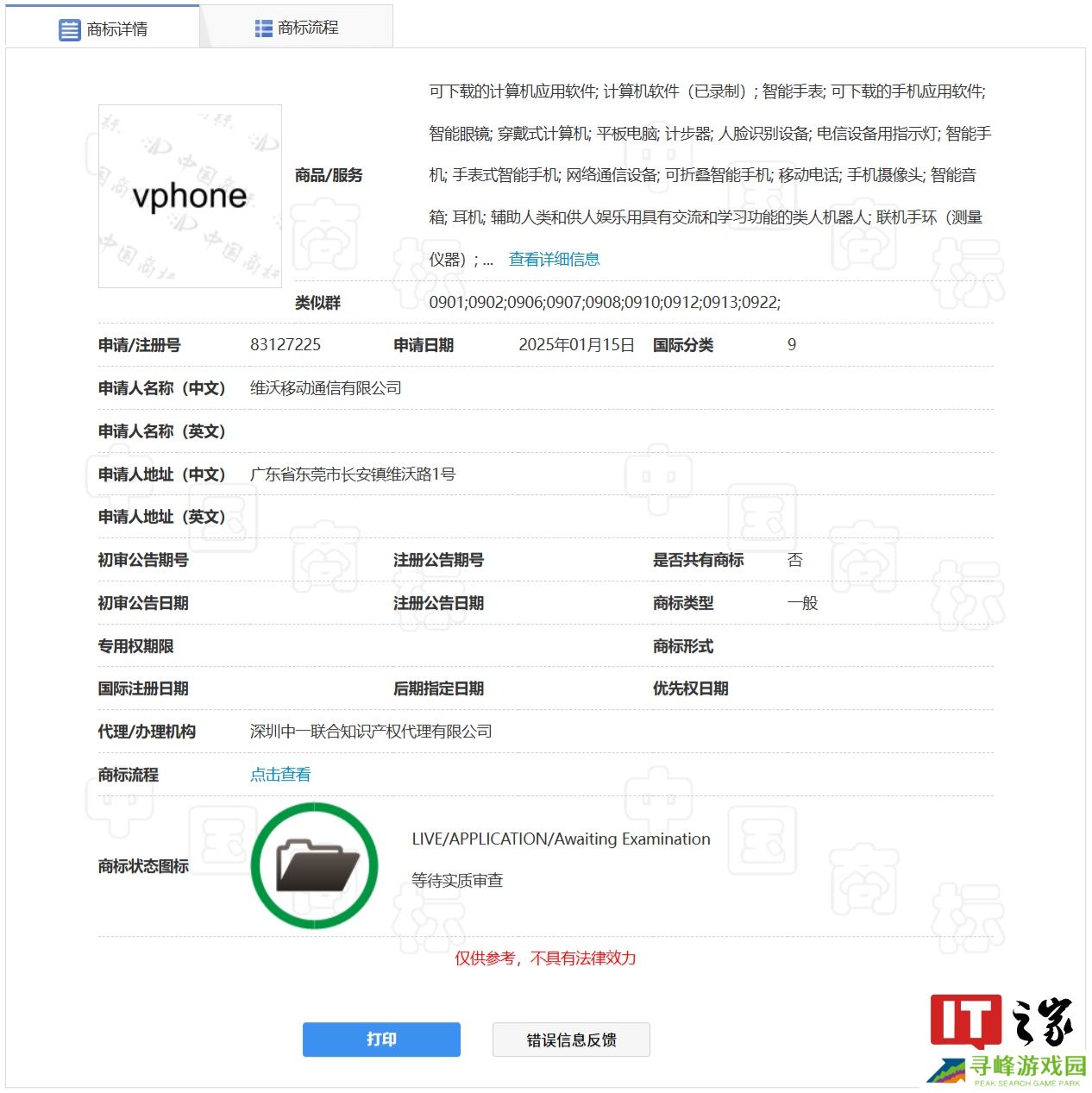 本站 2 月 12 日消息,中国商标网信息显示,2025 年 1 月 15 日,维沃移动通信有限公司申请注册了"vphone" 商标。