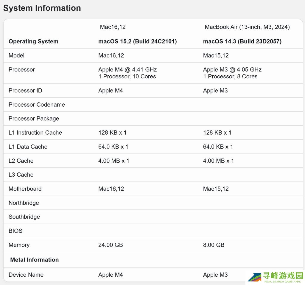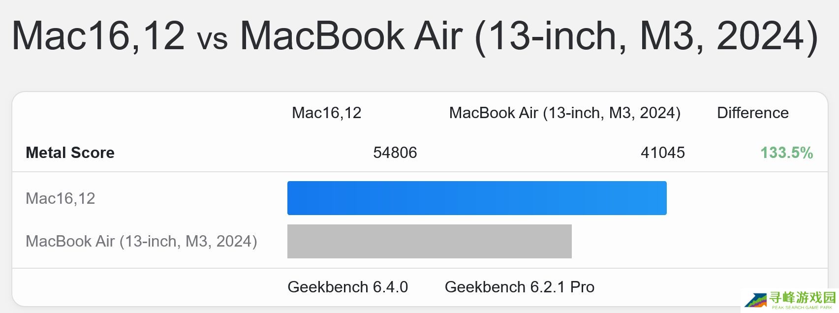 这与两款设备都采用轻薄设计,并非采用风扇散热,而是依靠静态散热技术。相比之下,配备 M4 芯片的 14 英寸 MacBook Pro 的 Metal 跑分可达 57477 分,得益于其风扇散热系统,略高于“Mac16,12”。