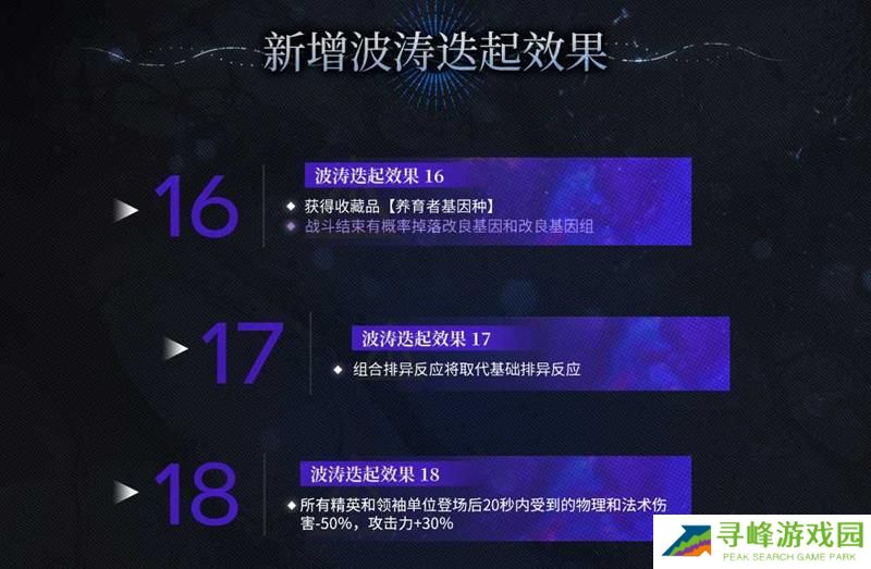 波涛迭起效果16:获得收藏品【养育者基因种】,战斗结束有概率掉落改良基因和改良基因组。