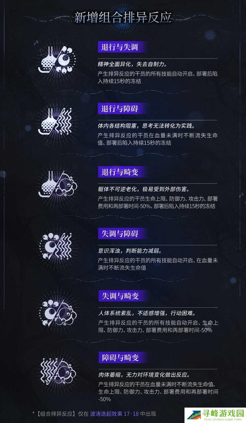 退行与畸变:躯体不可逆老化,极易受到外部伤害。产生排异反应的干员生命上限、防御力、攻击力、部署费用和再部署时间-50%,部署后陷入持续15秒的冻结。