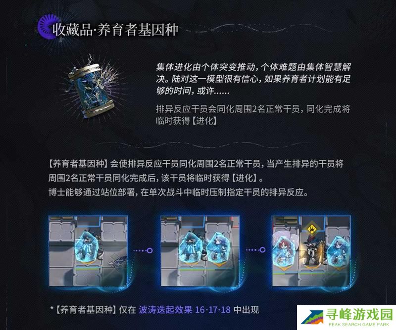 收藏品·养育者基因种:排异反应干员会同化周围2名正常干员,当产生排异的干员将周围2名正常干员同化完成后,该干员将临时获得【进化】。