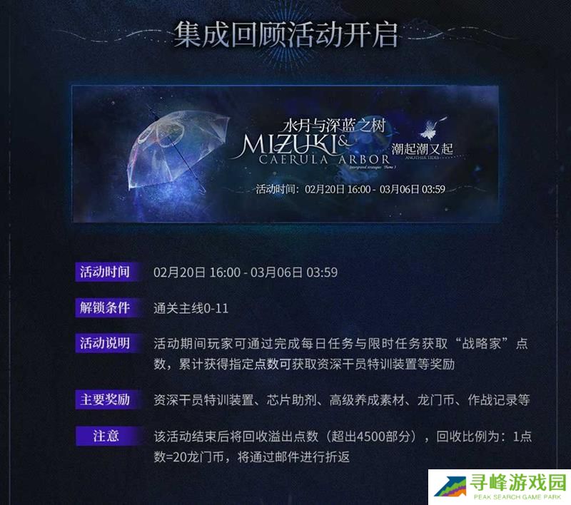 明日方舟官方发布公告将会对水月肉鸽开展新活动集成回顾「潮起潮又起」。下面是活动的详细内容,我们一起来看一看。