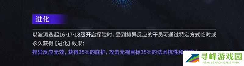 进化:以波涛迭起16·17·18级开启探险时,受到排异反应的干员可通过特定方式临时或永久获得【进化】效果。