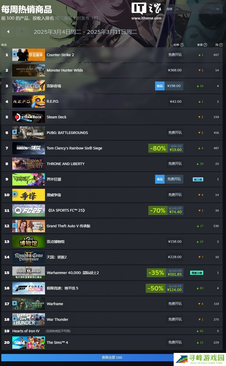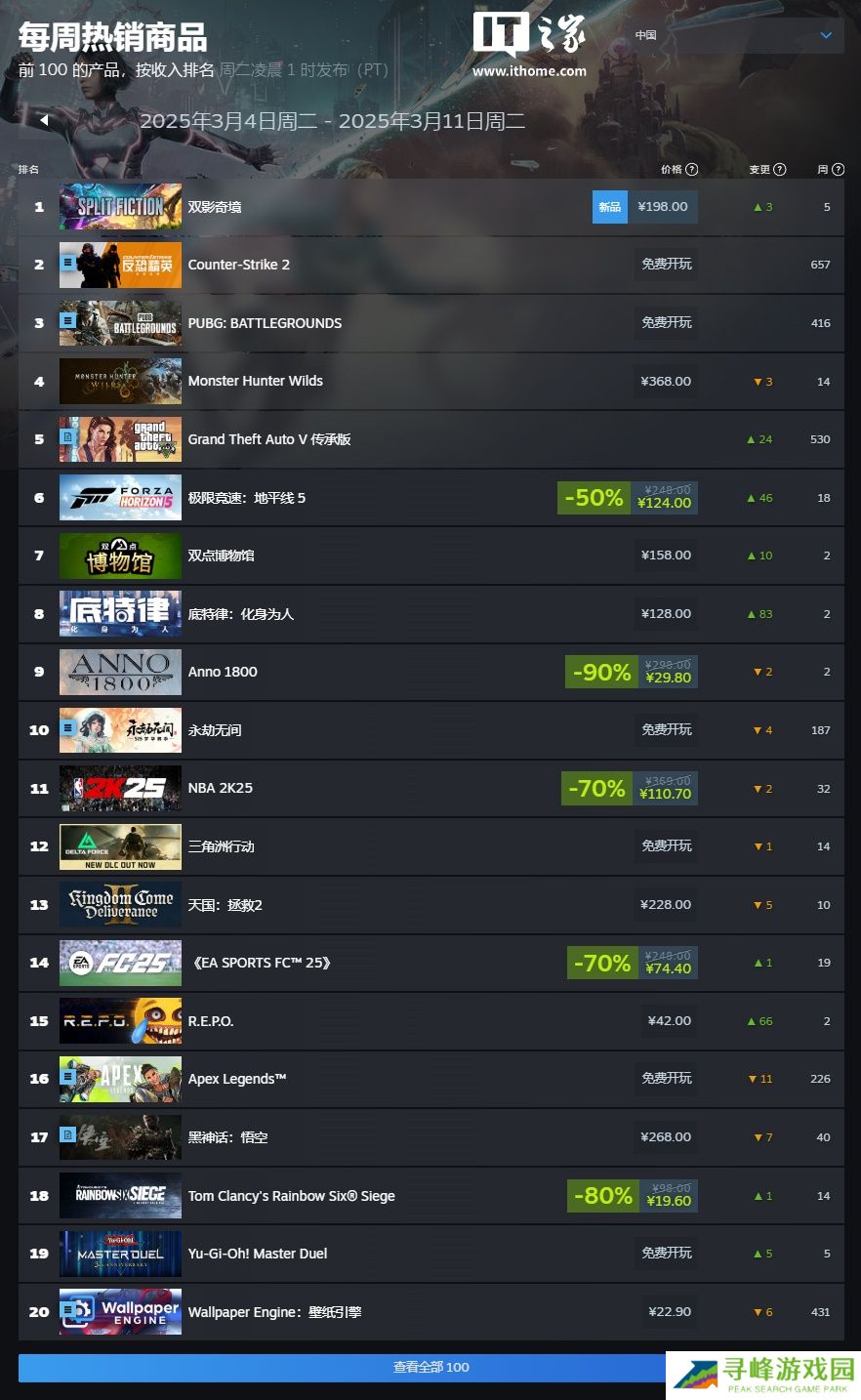 本站 3 月 12 日消息,Valve 昨晚公布了 Steam 最新一周游戏销量排行榜(2025 年 3 月 4 日至 3 月 11 日),本周《怪物猎人:荒野》再次登顶,已经达成三连冠,新发售的《双影奇境》紧随其后。