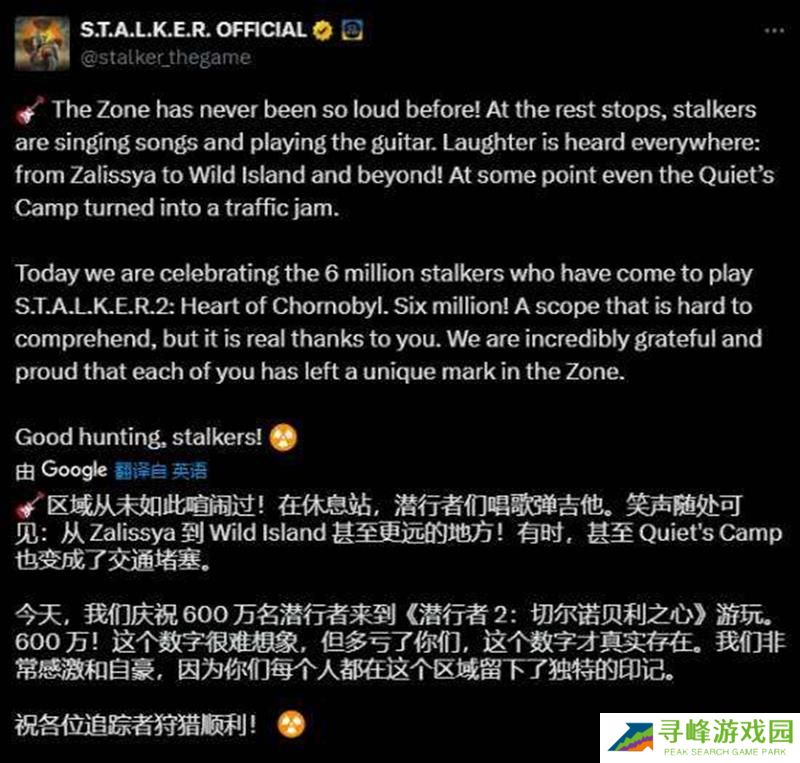 潜行者2:切尔诺贝利之心官方发布贺文,宣布游戏玩家数已突破600万人!官方表示:“这是一个难以想象的数字,但多亏了你们才让其真实存在,我们非常感激和自豪,你们每个人都在这里留下了独特的印记,祝各位追猎者狩猎顺利”。
