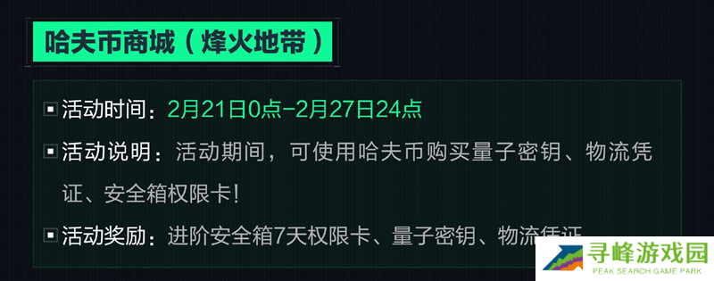 活动说明:活动期间,可使用哈夫币购买量子密钥、物流凭证、安全箱权限卡