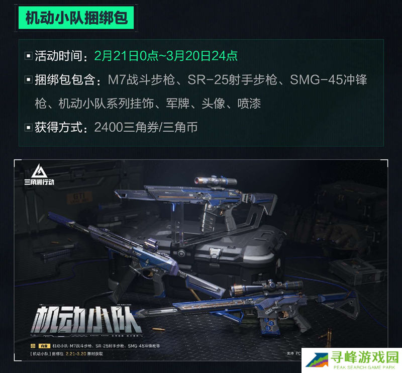 捆绑包包含: M7战斗步枪、SR-25射手步枪、SMG-45冲锋枪、机动小队系列挂饰、军牌、头像、喷漆