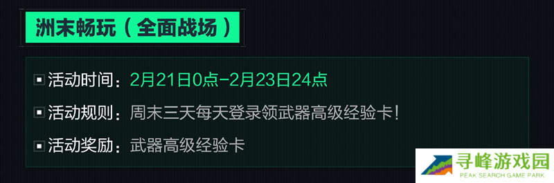活动规则: 周末三天每天登录领武器高级经验卡!