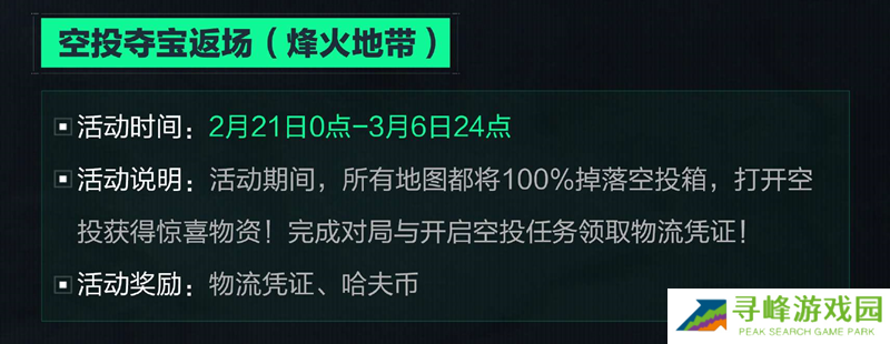 活动说明: 活动期间,所有地图都将100%掉落空投箱,打开空投获得惊喜物资!完成对局与开启空投任务领取物流凭证!