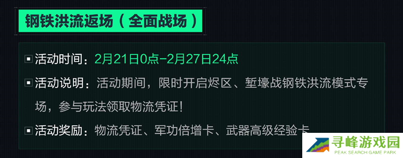 活动说明: 活动期间,限时开启烬区、堑壕战钢铁洪流模式专场,参与玩法领取物流凭证!