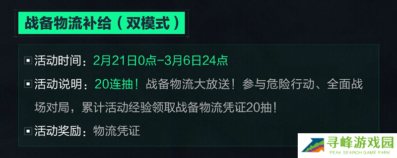 活动说明: 20连抽!战备物流大放送参与危险行动、全面战场对局,累计活动经验领取战备物流凭证20抽!
