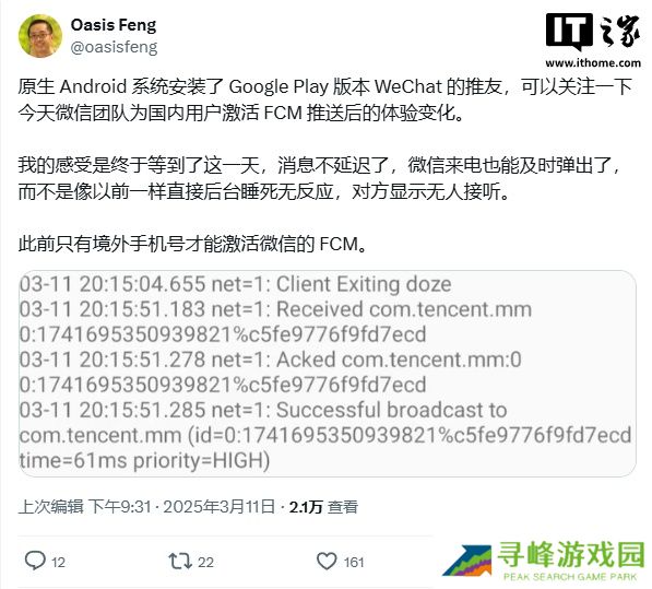他表示:“原生安卓系统安装了谷歌 Play 版本 WeChat 的推友,可以关注一下今天微信团队为国内用户激活 FCM 推送后的体验变化。”并提醒此前只有境外手机号才能激活微信的 FCM。这位开发者在群聊中表示:“游说微信团队半年多后,终于迎来转机了。”他说:“我的感受是终于等到了这一天,消息不延迟了,微信来电也能及时弹出了,而不是像以前一样直接后台睡死无反应,对方显示无人接听。”