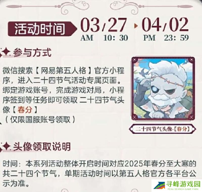 参与方式:微信搜索【网易第五人格】官方小程序,进入二十四节气活动专属页面。绑定游戏账号,完成游戏对局、小程序签到等任务即可领取二十四节气头像【春分】(仅限国服账号领取)。
