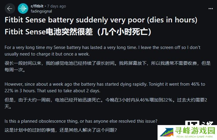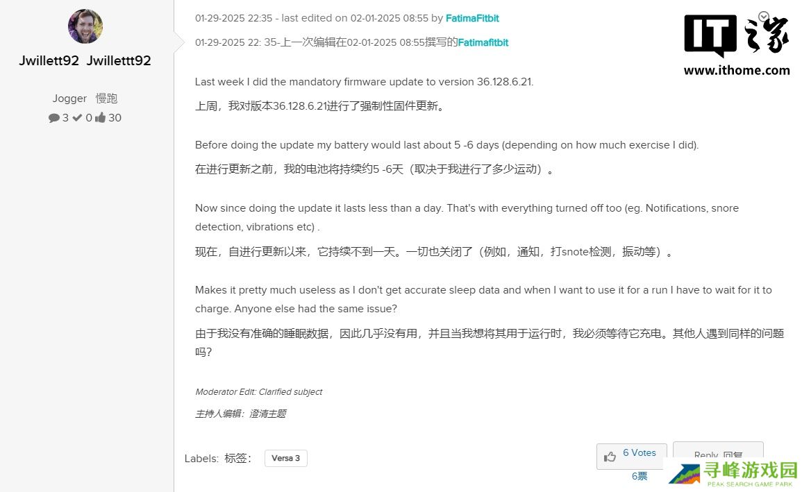 本站注意到,在 Reddit 上也有用户反映了类似的问题。一位用户称:“过去,我的 Sense 手表电池续航时间很长,我通常一周只需充电一次。然而,最近一周,电池开始迅速耗尽。昨晚,它在 3 小时内从 46% 降到了 22%,而过去这需要两天时间。”另一位用户也表示,自从 Fitbit 推送固件更新后,他开始遇到同样的问题。