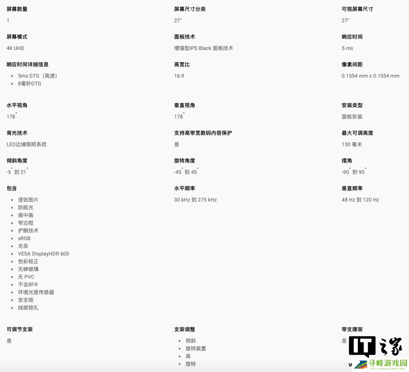 这款显示器配备3840x2160分辨率120Hz IPS Black面板,标准对比度3000:1,典型亮度450尼特,HDR峰值亮度600尼特,GtG响应速度5ms,支持 10-Bit 色彩,覆盖 99% DCI-P3 色域。