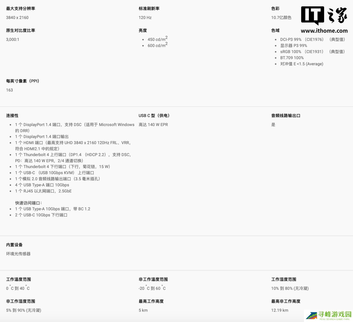这款显示器支架支持倾斜 / 升降 / 旋转,显示器本体支持VESA 100x100mm壁挂,提供2 个 DP1.4接口(其中 1 个支持DSC)、1个HDMI 2.1接口、1个雷电4接口(上行,140W PD充电,KVM)、1个雷电4接口(下行,15W充电菊花链)、1个 USB-C接口、1 个 3.5mm 音频接口、4个 USB-A 10Gbps接口、1个 RJ 45 接口。