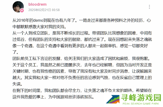 国产动作RPG游戏《失落之魂》(Lost Soul Aside)将于2025年内正式发售,自公布以来一直备受关注。早在先前,失落之魂团队前员工在曾在玩家群中发表不当言论,这些言论被曝光后,制作人杨冰回应称,该员工已于去年被解聘。近日失落之魂制作人杨冰发文回应前员工私下言论的争议,我们来看看。