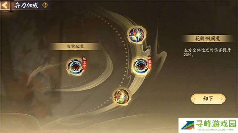 大人可在3个备选加成技能中选择1个携带,获得对应的技能加成效果。加成效果可在「花间取牌」和「花札退治」战斗中生效,助力大人与崽崽大展身手,战胜鬼王!