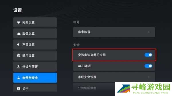 2.在小米盒子的【设置】-【账号与安全】里,选择允许安装未知来源的应用。