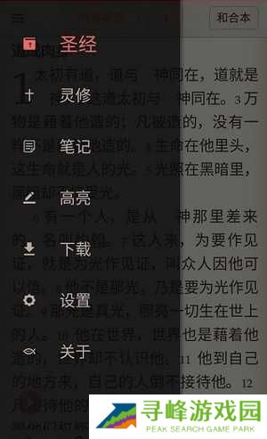 点击首页左上角,用户可以看到圣经、灵修、做笔记和设置等选项。