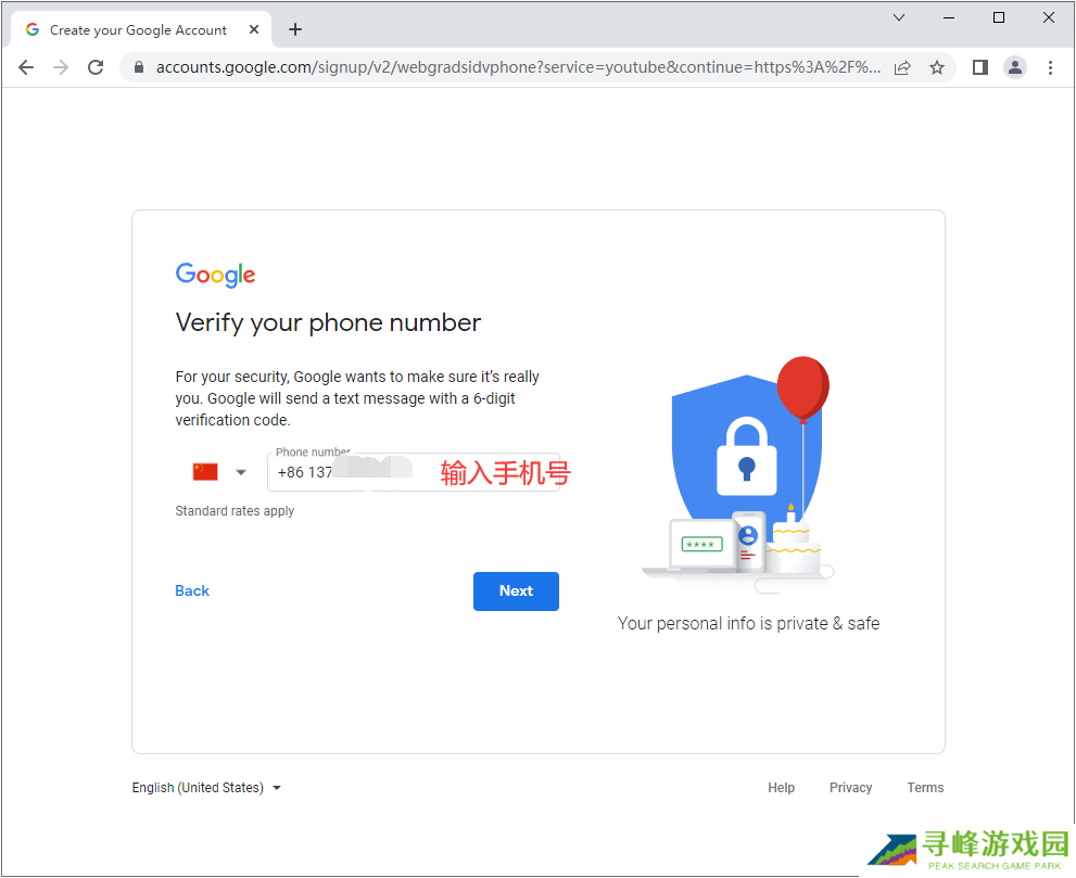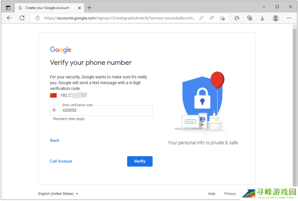 8、输入您收到的手机验证码,很多人在这一步就无法进行下去,主要是浏览器没有使用英文,而导致接受不到验证码,被谷歌提示“此电话号码不能用于验证。”。