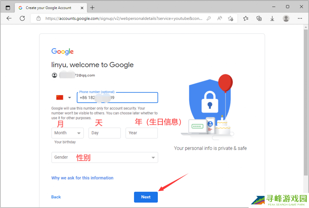 9、输入您的生日信息,包含年、月、日、以及性别。