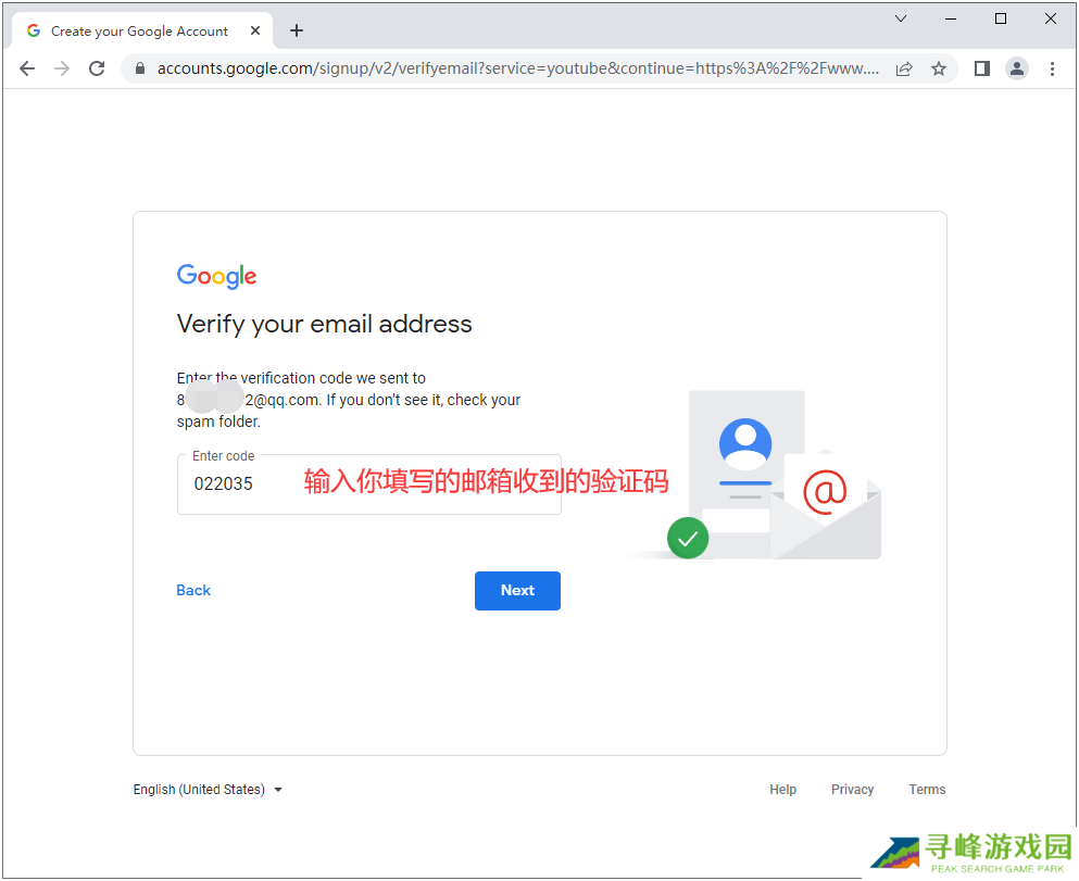 5、在该页面,您需要输入您填写的邮箱收到的验证码,然后点击“Next”按钮。