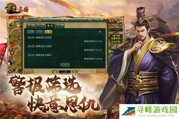 更新日志v1.63.0107版本1.金钻5及以上增加批量种植及一键采摘2.金钻5及以上增加快捷开封(封地模板)3.增加“强盾”“迅影”称号4.增加战场攻击策略模式5.国家动态军情增加跳转目标城池功能6.攻占、驻防城池军情增加跳转目标城池功能7.增加镖主可选优先入场功能8.基地、封地驻防数扩容至509.增加“骁骑兵、近卫兵、弩骑兵、投石车”经典皮肤10.增加角色头像图11.增加战场等待区栅栏12.增加新活动模板展示13.优化强化界面可批量使用材料包14.将领佩戴装备界面展示优化15.游戏公告展示优化16.部分bug、图片、文字内容优化v1.62.0427版本军情BUG修复v1.62.0425版本1、新增帅府战法2、新增将领、称号、成就3、新增战报回放进度条功能4、新增称号达成条件指引5、新增军情关注功能6、新增屏蔽走马灯警报功能7、新增战法使用场景8、新增兑换时效道具9、优化装备兑换活动10、部分图片素材、文字优化11、部分BUG修复v1.61.1206版本1、新增帅府功能2、新增4个史诗名将3、新增战场战斗坑位倾斜模式(默认旧版坑位展示)4、优化放弃存在高成长俘虏的封地提醒5、优化放弃高成长俘虏提醒6、优化战斗逻辑及卡顿问题7、调整部分挑战赛规则内容8、部分文字及图片优化9、部分BUG修复v1.60.0615版本1、新增挑战赛功能2、新增将领、称号、装备3、新增军团长禅让功能4、新增**召回道具5、新增攻、防、攻速增益道具批量使用功能6、新增征调兵马道具批量使用功能7、新增势力地图自有城池分布展示8、银票宝库占位优化9、金钻山贼宝箱优化10、部分文字及图片优化11、聊天屏蔽功能优化12、部分BUG修复