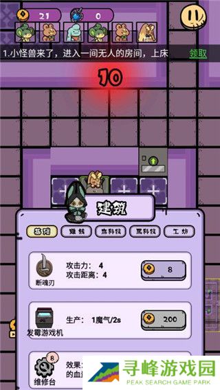 2、快速升级床进入房间先升级床,然后给铁门升级到铁门2,这个时候如果没有猛鬼来攻击你,不要升级床或者建造武器,快速升级到简陋小床,开始吃8金币的利息,然后可以适当建造三个武器,如果没有鬼来攻击你,门可以升级到铁门5级,然后继续攒钱升级到精装床铺。