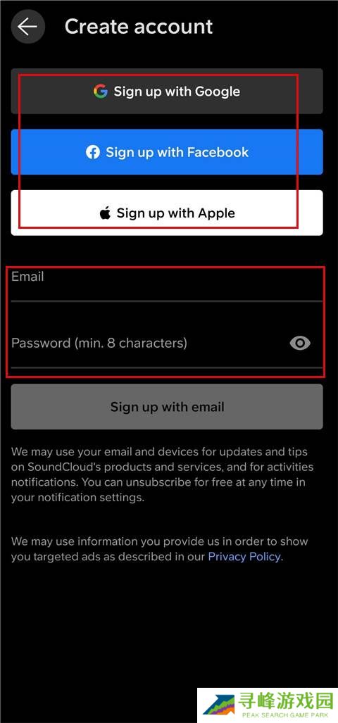 如何注册SoundCloud?1、打开软件,点击createe an 可以开始建立account